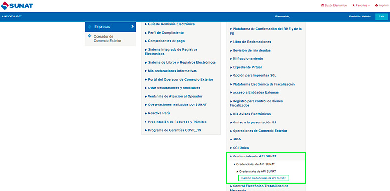 Al ingresar a SUNAT, seleccionamos Credenciales de API SUNAT/ Credenciales de API SUNAT/ Credenciales de API SUNAT y por último Gestión Credenciales de API SUNAT.
